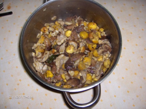 Cansados dos últimos dias, extenuados, sem ideias para o almoço, rumámos até à Roda, Cardigos, e pedimos ao António Martins Ribeiro que nos deixasse entrar para almoçar ( o jantar dele,ontem, como confessou no Facebook!!!) estes cogumelos com castanhas!!!