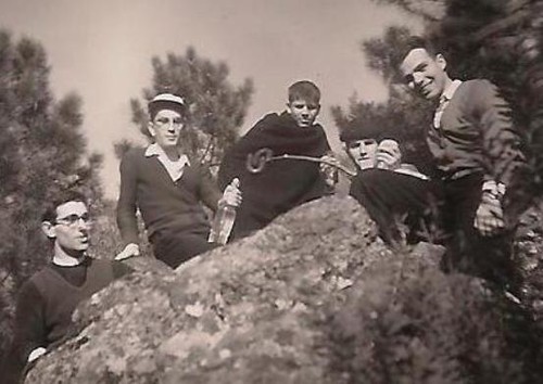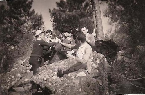 A foto que te poderia enviar (talvez ainda encontre uma outra qualquer), já a tens. Vais às fotos que publicaste por ocasião do Encontro de Portalegre e encontras o Bengala Escarameia naquela foto da serra de Portalegre, das chouriças assadas, enfiadas num pau. O primeiro, à esquerda, de cabeção, é o Escarameia. A seguir estou eu, de boné e com a garrafa na mão. Depois está o Zé da Luz e o da direita é o Alexandre Ramos Pires.